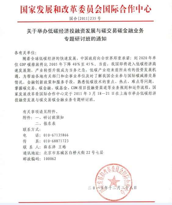經國家發改委國際合作中心授權,現將國合【2011】235號文件關于2011年3月18日—21日在上海市舉辦“低碳經濟投融資發展與碳交易碳金融業務專題研討班”通知轉發如下, 屆時將邀請國家發改委能源所、國務院發展研究中心、清華大學、財政部清潔發展機制基金管理中習等有關單位領導專家,現場授課交流,歡迎各會員單位報名參加。具體可與本站聯系方式中明確的郵件及電話聯系,也可直接與附件中會務組聯系。