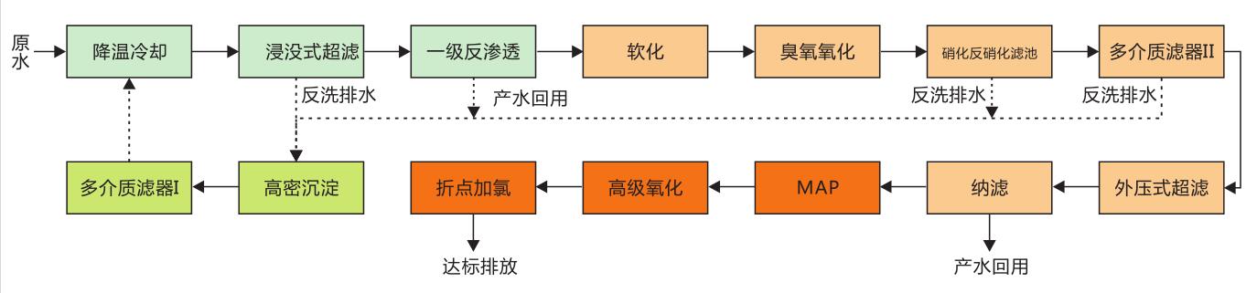 廢水經(jīng)浸沒式超濾和反滲透系統(tǒng)處理后,產(chǎn)水回用,濃水經(jīng)軟化后,進(jìn)入臭氧氧化和硝化-反硝化系統(tǒng),降低水中CODcr、氨氮和總氮等污染物含量,出水經(jīng)過濾后進(jìn)入納濾系統(tǒng),納濾產(chǎn)水作為企業(yè)消防用水,納濾濃水再經(jīng)過MAP和“芬頓+臭氧+BAC”的高級(jí)氧化組合工藝處理后,達(dá)到GB13456-2012表3排放標(biāo)準(zhǔn)。