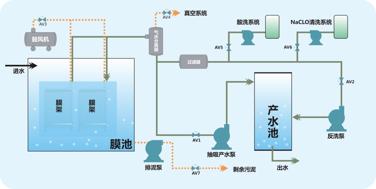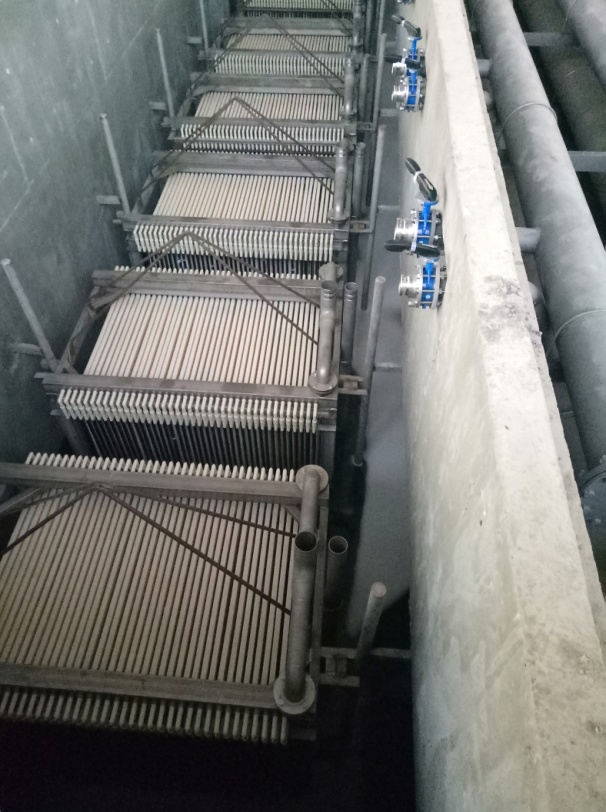 本工程深度處理單元設(shè)計(jì)規(guī)模3.0萬(wàn)m3/d,處理工藝為天創(chuàng)環(huán)境自主研發(fā)的高效膜生物反應(yīng)器(MBR)集成技術(shù)。核心產(chǎn)品采用PVDF增強(qiáng)型復(fù)合超濾膜,產(chǎn)品具有柔韌性好、不易斷絲、耐氧化性強(qiáng)、過濾精度高、產(chǎn)水水質(zhì)好、操作維護(hù)簡(jiǎn)便等特點(diǎn)。經(jīng)過MBR系統(tǒng)處理后,產(chǎn)品水CODCr穩(wěn)定在30mg/L以下,NH3-N穩(wěn)定在2mg/L以下,濁度穩(wěn)定在0.1NTU以下,可滿足準(zhǔn)IV類水水質(zhì)標(biāo)準(zhǔn)。